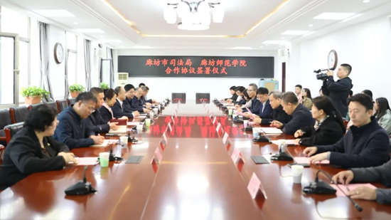 廊坊师范学院纪委书记樊亚峰、副校长时培磊,社会发展学院党委书记韩剑波、院长王荣芳等校方领导、师生代表,市司法局党组成员副局长杨海洋、张丽洁、赵富宽及相关处室负责同志参加签约仪式。